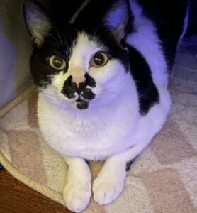 出会い: 親友からの紹介でご縁があって迎えた元野良猫の女の子。白黒のハチワレ模様がチャームポイントです。